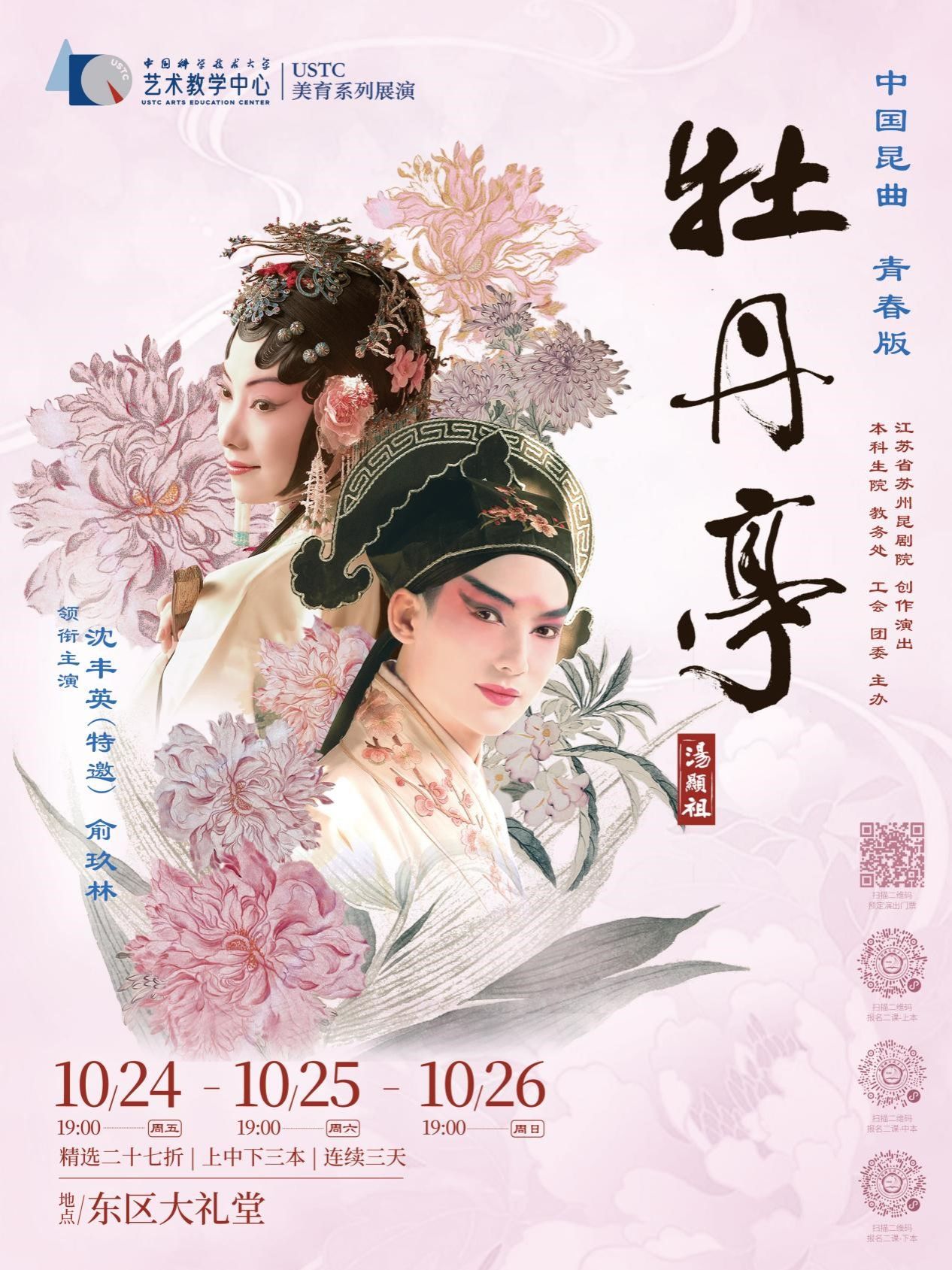 为传承和弘扬中华优秀传统文化,丰富学校美育文化活动,本科生院、教务处、工会和团委主办的“USTC美育系列展演”之青春版昆曲《牡丹亭》全本将于10月24日-26日在校内举行。