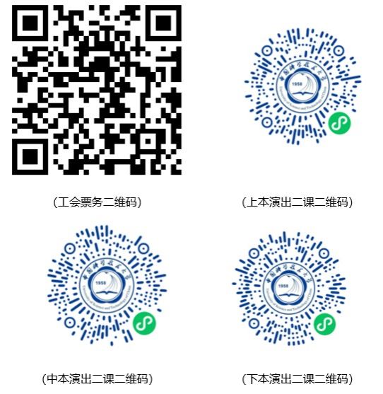 本场演出通过工会订票系统预约,演出分为上、中、下三本,连演三天,每场演出分开订票。每人限订2张,按座位就坐(可扫描下方二维码跳转订票);本次演出纳入第二课堂,可进入“青春科大”智慧团学综合信息平台报名(可扫描下方二维码报名)。