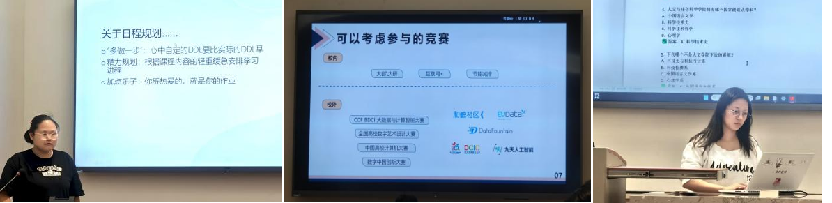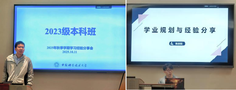 首先孙老师介绍了本次分享会的主要议程,接下来,高年级优秀学生代表陈宗阳作了主题为“学业规划与经验分享”的汇报,他从奖学金申请与选课建议、参与竞赛、就业与深造等方面进行了细致分享,提醒同学们应注重自我提升,包括参加竞赛和项目实践,以提高竞争力。
