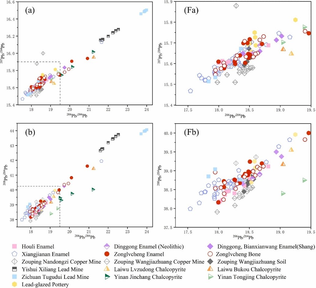铅同位素示踪分析表明,当地人群铅污染主要来源于泰沂山脉矿区,其中邻近的邹平铜矿、淄川铅矿或为核心来源,泰沂山脉高放射成因铅铜铅矿带也贡献了部分 HRL 信号。新石器时代人群206Pb/204Pb 比值均值约 18.1,代表本地自然背景特征;随着泰沂山脉矿产开发,体内铅含量较高的个体,其同位素比值逐渐向 18.5 集中,与邹平、淄川矿区的同位素特征高度吻合。同时研究发现,东汉时期人群的铅同位素特征与铅釉陶一致,铅釉陶的普及或为东汉当地人群铅暴露水平骤升的重要因素。