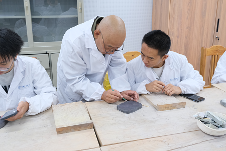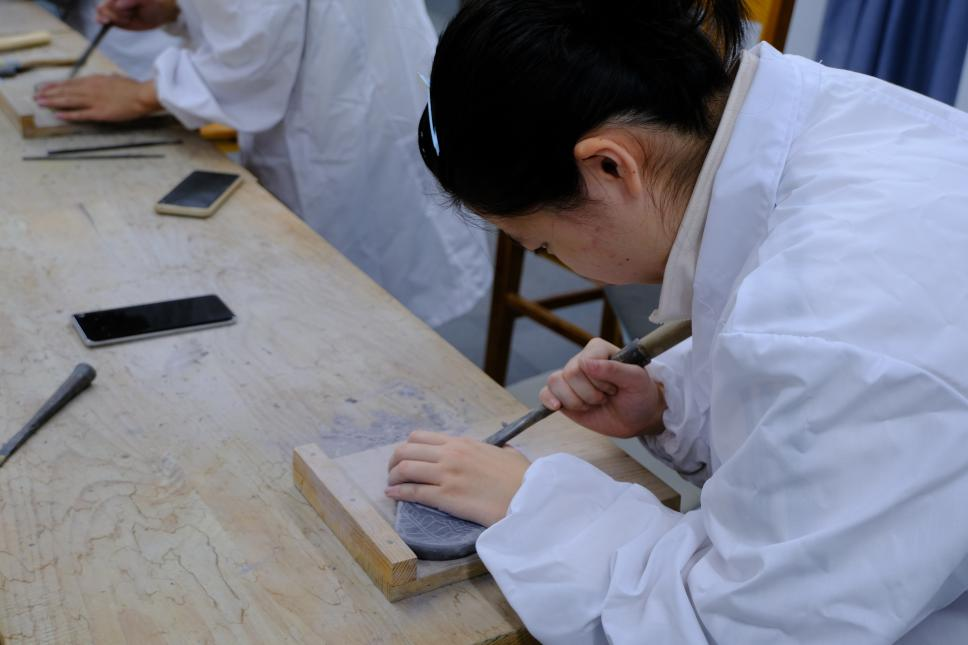 在砚工坊,朱岱从歙砚的发展历史、传承制作手艺、工艺特征、传承保护等方面为同学们进行详细讲解,随后指导同学们认识石纹理与各式刻刀,大家亲手磨制刻刀,并在砚坯上初步体验打磨与线刻,体会“金石之趣”。