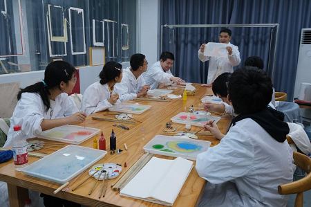 而在加工纸区域,刘靖则如数家珍般地展示了包括真金粉蜡笺、流沙笺、草木染纸在内的数十种精美加工纸样本,其绚丽的色彩与精湛的工艺引得同学们阵阵惊叹。刘靖带领同学们认识纸笺的类型、染色的原料并现场教学流沙笺制作,以画笔牵引颜料在水中流动成纹,纸覆水吸附成形,灵动纹理跃然纸上。同学们沉浸式体验流沙笺制作,完成创意作品,深入体验了非遗的魅力与匠心传承。
