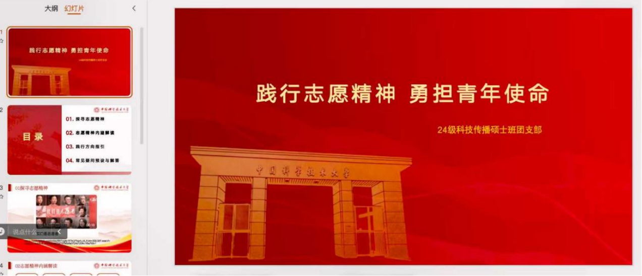 为深入践行习近平总书记关于志愿服务的重要指示精神,弘扬“奉献、友爱、互助、进步”的志愿精神,引导青年团员深刻体悟志愿服务的时代价值与责任担当,12月10日,科技传播系2024级硕士班团支部成功举办“践行志愿精神 勇担青年使命”线上主题团日活动。