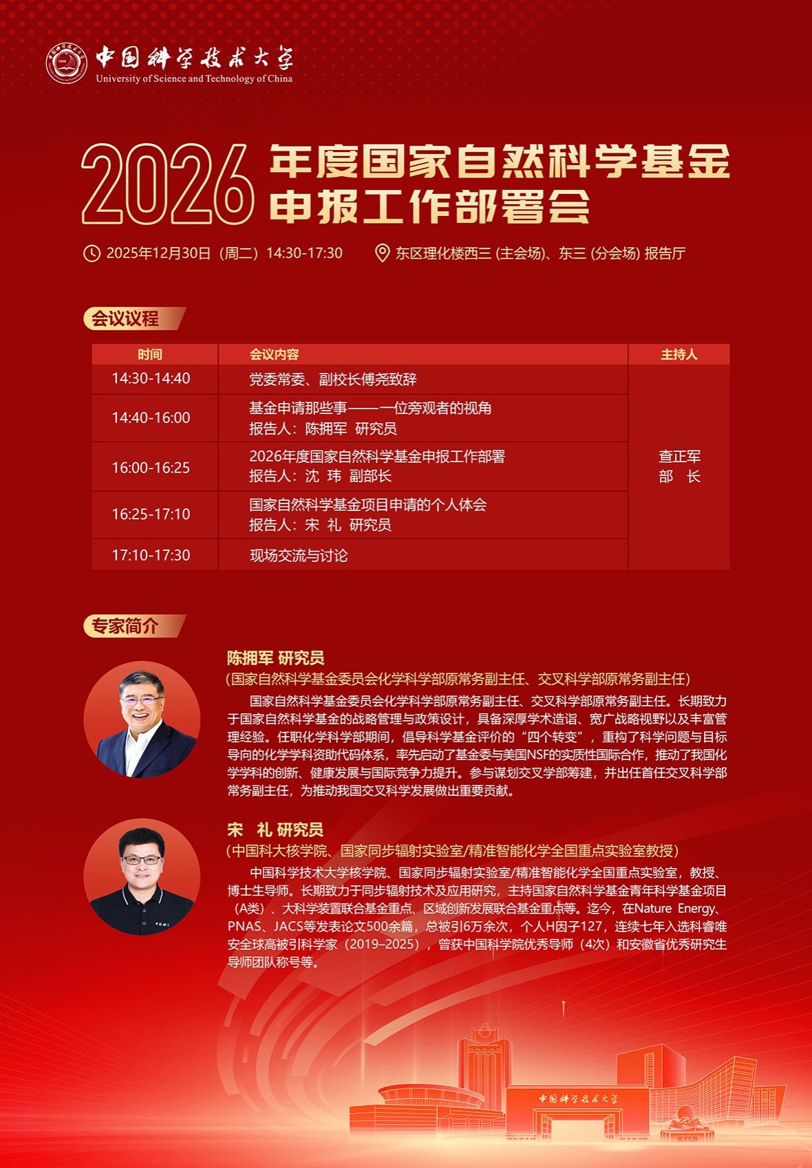 为做好2026年度国家自然科学基金项目申报工作,提升我校基金项目的申报质量,学校将于2025年12月30日(周二)下午14:30在东区理化大楼西三、东三报告厅组织召开“2026年度国家自然科学基金申报工作部署会”。