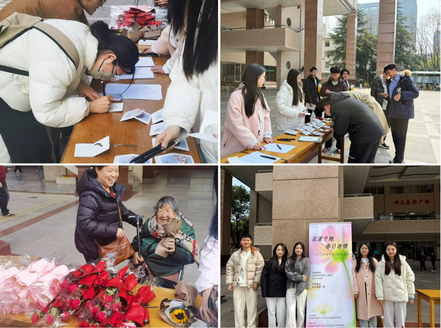 3月8日,由人文与社会科学学院主办,学院团委、研究生会承办的“花漾予她 春日寄情”留言赠花活动在东区美食广场顺利开展。