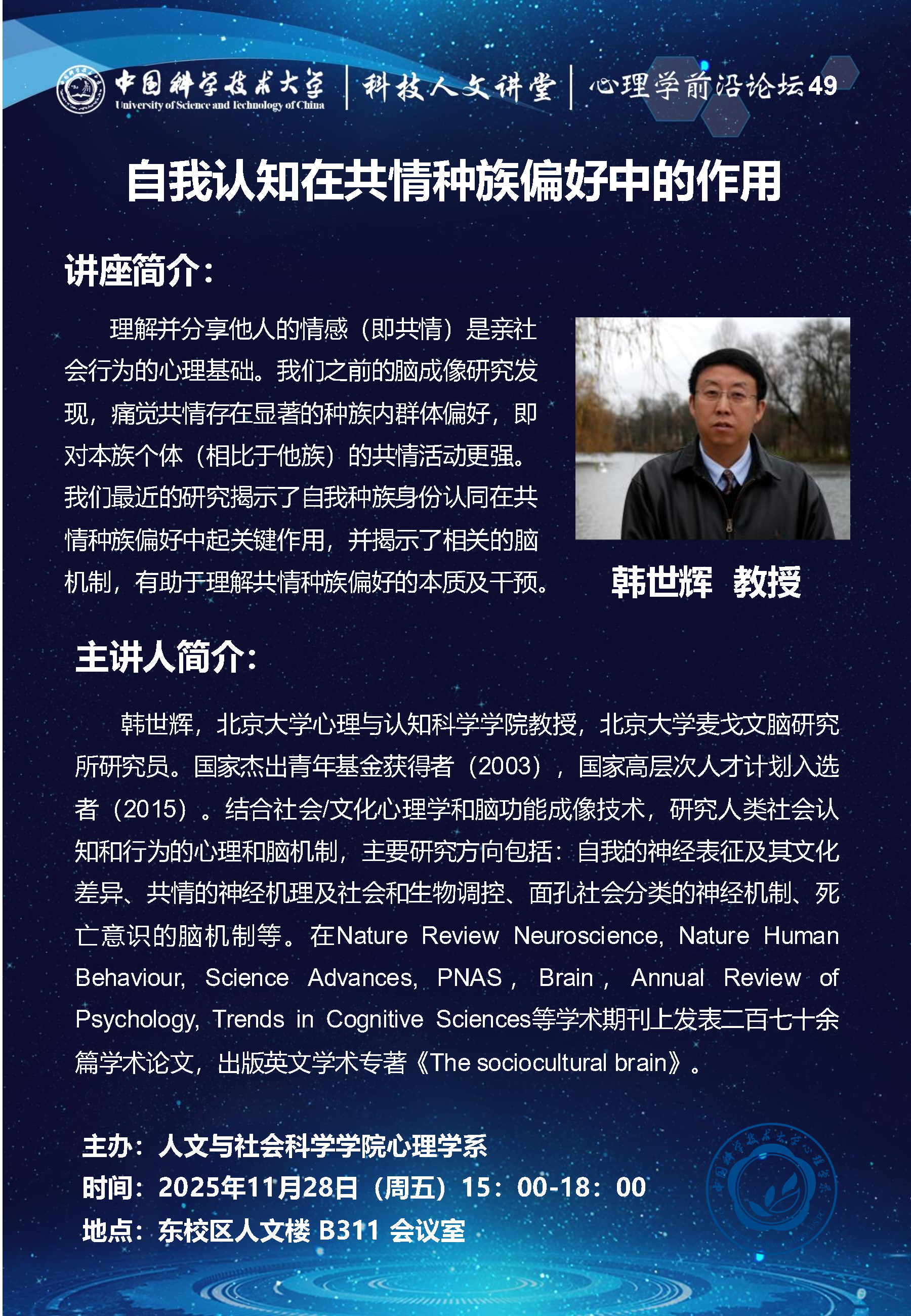 科技人文讲堂 | 心理学前沿论坛49|自我认知在共情种族偏好中的作用