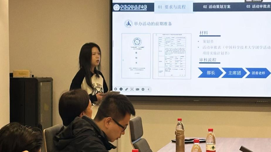 会议第二项,主席团成员何其霖介绍了研会活动方案和审批表的撰写与审核流程。她从举办活动的要求与流程、策划方案撰写和活动审批表填写三个方面向新成员详细讲解了活动从前期准备到后期收尾的全流程注意事项。