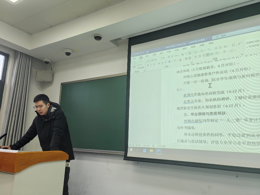 随后,孙启孟对上学期班级整体学习情况进行全面总结。他肯定了全班同学在上学期取得的成绩,对大家的勤奋努力和团结协作精神表示赞赏。同时,他结合班级实际,部署新学期班级工作计划与活动安排,明确将聚焦升学与就业指导,开展“学长学姐专业经验分享会”等活动,并推进校内外实践项目,助力同学们明晰发展方向、提升专业素养、积累实践经验。