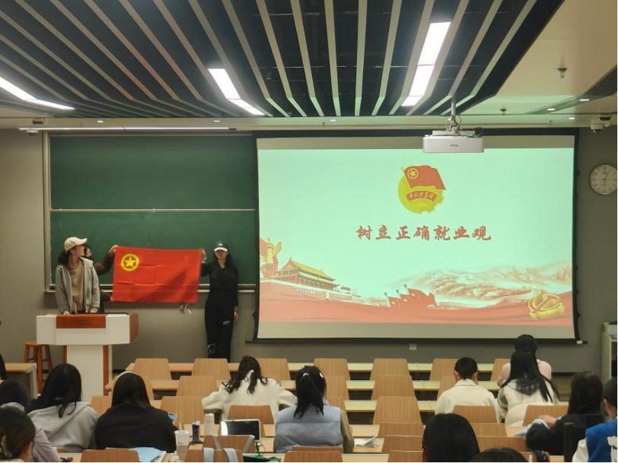 团课中,熊姝涵围绕“正确就业观的核心内涵”“树立正确就业观的关键措施”及“当前就业形势下的行动建议” 三大板块展开讲解。在核心内涵阐释环节,她指出,正确的就业观要求将个人职业理想置于“个人理想—国家需要—时代机遇”的三维坐标中考量。青年唯有将个人追求与国家建设需求相结合,才能在职业发展中更好实现自我价值。在实践路径上,她建议同学们秉持“先就业后择业”的理念,基于现实情况调整就业期望,拓宽就业视野,勇于从基层岗位积累经验,逐步实现职业目标。